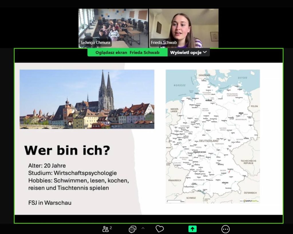 Zadaliśmy pytania niemieckiej koleżance oraz nauczyliśmy ją kilku polskich słów… Bardzo nam się podobało kolejne spotkanie z projektu Deutsch Plus z radosną i przesympatyczną studentką z Regensburga.![]()