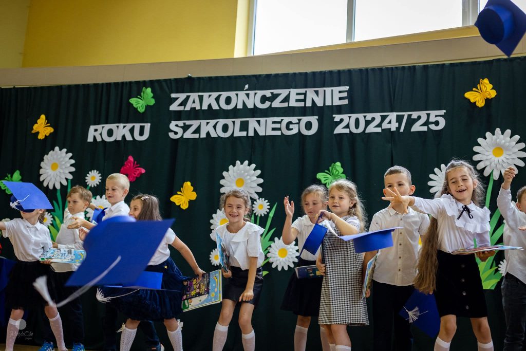 Uroczystość zakończenia roku szkolnego 2024/2025 była pełna emocji i wzruszeń, szczególnie dla uczniów klas ósmych oraz najstarszej grupy przedszkolnej „Malinki”, którzy mieli szczególny udział w tym wyjątkowym wydarzeniu. Obchody rozpoczęły się od Mszy Świętej. Następnie, zgodnie z tradycją, ósmoklasiści zatańczyli poloneza. Ich występ był pełen gracji i dumy, a jednocześnie wzruszający – była to ich ostatnia taneczna chwila w murach szkoły podstawowej, symbolizująca przejście w nowy etap edukacji. Kolejno ósmoklasiści przekazali sztandar młodszym kolegom, złożyli uroczyste ślubowanie oraz odśpiewali wspólne piosenki. To była chwila pełna powagi, kiedy kończyli swoją drogę szkolną i rozwiązywali społeczność klasową, pozostawiając za sobą lata wspólnych doświadczeń, sukcesów, ale i trudności.