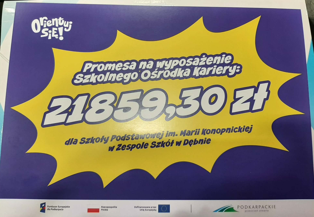 Dnia 19 grudnia w Urzędzie Marszałkowskim w Rzeszowie odbyło się uroczyste wręczenie promes w ramach projektu „Orientuj się”, dzięki któremu nasza szkoła otrzymała wsparcie w wysokości 21 859, 30 zł. Projekt ten ma za zadanie wsparcia Szkolnych Ośrodków Kariery, które poświęcone są doradztwu zawodowemu.
